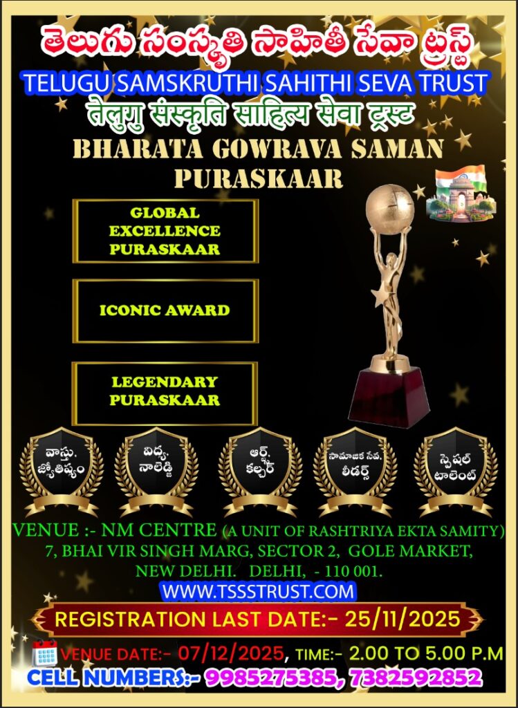మంచిర్యాల ప్రత్యక్షత:- తెలుగు సంస్కృతి సాహితీ సేవా ట్రస్ట్ ఆధ్వర్యంలో వివిధ రంగాలలో కృషి చేస్తున్న వారిని భారత గౌరవ సన్మాన పురస్కార్ పేరిట జాతీయ పురస్కారాలతో సత్కరించడం జరుగుతుందని ట్రస్ట్ నిర్వాహకులు డాక్టర్ మాచవరం గౌరీశంకర్ గురువారం ప్రకటనలో తెలిపారు. సేవా ట్రస్ట్ ఆధ్వర్యంలో వివిధ రంగాలలో కృషిచేసిన వారికి జాతీయ స్థాయిలో భారత గౌరవ సమ్మాన్ పురస్కారంతో పాటు గ్లోబుల్ ఎక్స్లెన్సీ పురస్కారం, ఐకానిక్ అవార్డు, లెజెండరీ పురస్కారాలతో సత్కరించి, వారి సేవలను అభినందిస్తూ, వారిని ప్రోత్సహించడం జరుగుతుందని తెలిపారు. వాస్తు, జ్యోతిష్యం, విద్య, నాలెడ్జ్, కల్చరల్, సామాజిక సేవ, లీడర్స్, స్పెషల్ టాలెంట్ తదితర వివిధ రంగాలలో పనిచేస్తున్న వారు ఈ పురస్కారాలకు దరఖాస్తులు చేసుకోవచ్చునని తెలిపారు. ఆసక్తి గల అభ్యర్థులు నవంబర్ 25, 2025 తమ దరఖాస్తులను అందజేయాలని సూచించారు. దేశ రాజధాని అయిన న్యూఢిల్లీలోని భాయ్ వీర్ సింగ్ మార్క్, సెక్టార్ 2 గోలే మార్కెట్ లో గల యూనిట్ ఆఫ్ రాష్ట్రీయ ఏక్తా సమితిలో భాగమైన నెంబర్ 7 లోని ఎన్ఎం సెంటర్ లో డిసెంబర్ 07, 2025న నిర్వహించు కార్యక్రమంలో వారిని జాతీయ స్థాయి పురస్కారాలతో సత్కరించడం జరుగుతుందన్నారు. మరిన్ని వివరాలకు 9985275385, 7382592852 సెల్ నెంబర్లను సంప్రదించాలని సూచించారు.