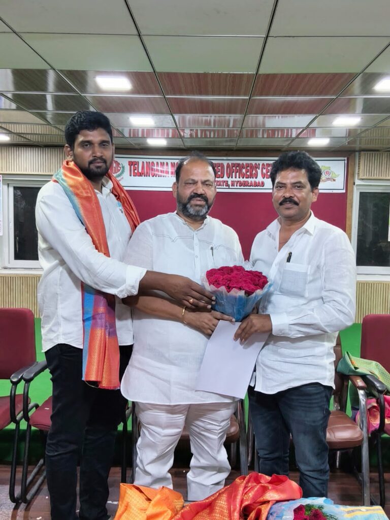 మంచిర్యాల ప్రత్యక్షత:- రెండవ సారి ఏకగ్రీవంగా ఎన్నికైన టీఎన్జీవో కేంద్ర సంఘం అధ్యక్షులుగా మారం జగదీశ్వర్,ప్రధాన కార్యదర్శి డాక్టర్ ఎస్ ఎం హుస్సేనీ ముజీబ్ కి హైదరాబాద్ నాంపల్లి రాష్ట్ర టీఎన్జీవో భవన కార్యాలయంలో మంచిర్యాల టీఎన్టీవో జిల్లా అధ్యక్షులు గడియారం శ్రీహరి ఆధ్వర్యంలో జిల్లా టిఎన్జీవో తరఫున శాలువాతో సన్మానించి ప్రత్యేక శుభాకాంక్షలు తెలియజేశారు. అనంతరం గడియారం శ్రీహరి, కేంద్ర సంఘం అధ్యక్షులు మారం జగదీశ్వర్ కి పలు ఉద్యోగుల సమస్యలపై చర్చించారు. మారం జగశ్వర్ స్పందిస్తూ రాష్ట్రంలో ఉన్న ఉద్యోగుల సమస్యల పైన రాష్ట్ర ముఖ్యమంత్రి సమావేశం ఏర్పాటు చేసి ఉద్యోగుల సమస్యల పరిష్కారం లభించే విధంగా చర్యలు చేపడతామని తెలిపారు. అలాగే టిఎన్జీవో మంచిర్యాల జిల్లా మాజీ కార్యదర్శి భూముల రామ్మోహన్ సేవలను గుర్తు చేస్తూ సన్మానించారు.టీఎన్జీవో మంచిర్యాల జిల్లాలో ఏర్పడిన క్యాజువల్ వేకెన్సీలు కేంద్ర సంఘం అధ్యక్షులు మారం జగదీశ్వర్ అధ్యక్షతన కో ఆప్షన్ పద్ధతిలో ఏకగ్రీవంగా ఎన్నుకున్నారు.