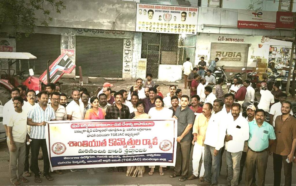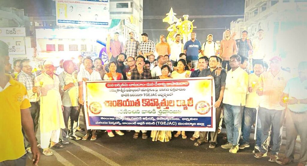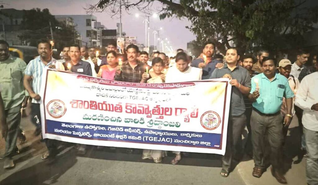 జమ్మూ కాశ్మీర్ పహాల్గంలో జరిగిన ఉగ్రదాడికి నిరసనగా టీజీఈజేఏసీ జిల్లా చైర్మన్ గడియారం శ్రీహరి ఆధ్వర్యంలో జిల్లా కేంద్రమైన మంచిర్యాల పట్టణంలో భారీ నిరసన ర్యాలీ నిర్వహించారు. ఈ సందర్భంగా మంచిర్యాల పట్టణంలోని టిఎన్జీవో భవనం నుండి బెల్లంపల్లి చౌరస్తా వరకు కొవ్వొత్తుల ర్యాలీ నిర్వహించి, అనంతరం దాడిలో మరణించిన మృతులకు ఘనంగా నివాళులు అర్పించారు. ఈ సందర్భంగా టిజిఈజేఏసీ జిల్లా చైర్మన్ గడియారం శ్రీహరి మాట్లాడుతూ.. భారతీయులపై పాకిస్తాన్ ఉగ్రవాదులు దాడి చేయడం అత్యంత బాధాకరమని తెలిపారు. చనిపోయిన వారి కుటుంబాలకు సానుభూతి తెలియజేస్తూ,వారి కుటుంబ సభ్యులు మనోధైర్యంతో ఉండాలని సూచించారు.