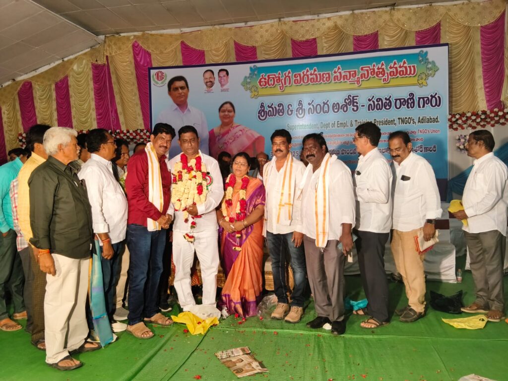 మంచిర్యాల ప్రత్యేక్షత:-ఉమ్మడి ఆదిలాబాద్ జిల్లా కో-ఆర్డినేటర్ టీజీఈజేఏసీ, టీఎన్జీవో జిల్లా అధ్యక్షుడు సంద అశోక్ పదవి విరమణ సన్మాన సభకు హాజరైన టీఎన్జీవో కేంద్ర సంఘం అధ్యక్షులు మారం జగదీశ్వర్, ప్రధాన కార్యదర్శి ముజీబ్ హుస్సేన్ లు హాజరయ్యారు. అదేవిధంగా మంచిర్యాల జిల్లా టీఎన్జీవో అధ్యక్షులు గడియారం శ్రీహరి ఆధ్వర్యంలో సంద అశోక్ పదవి విరమణ సభలో ఆయన చేసిన సేవలు గురించి ప్రతి ఒక్కరు మాట్లాడారు.అనంతరం సంద అశోక్ దంపతులకు పూలమాలలు వేసి, చిత్రపటాన్ని అందించి శాలువాతో ఘనంగా సత్కరించి పదవి విరమణ శుభాకాంక్షలు తెలియజేశారు.