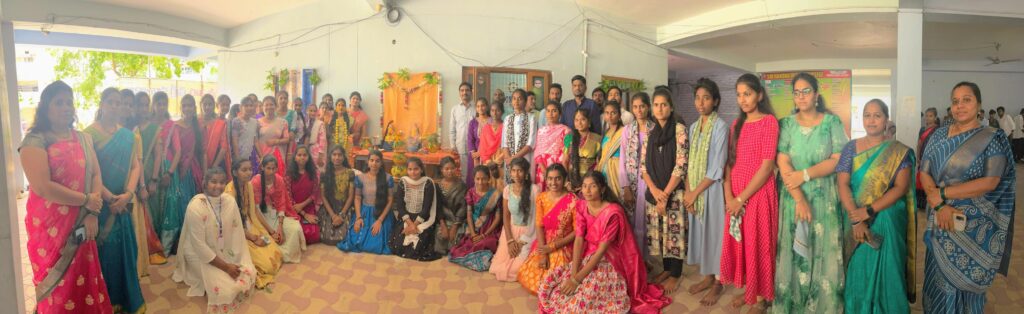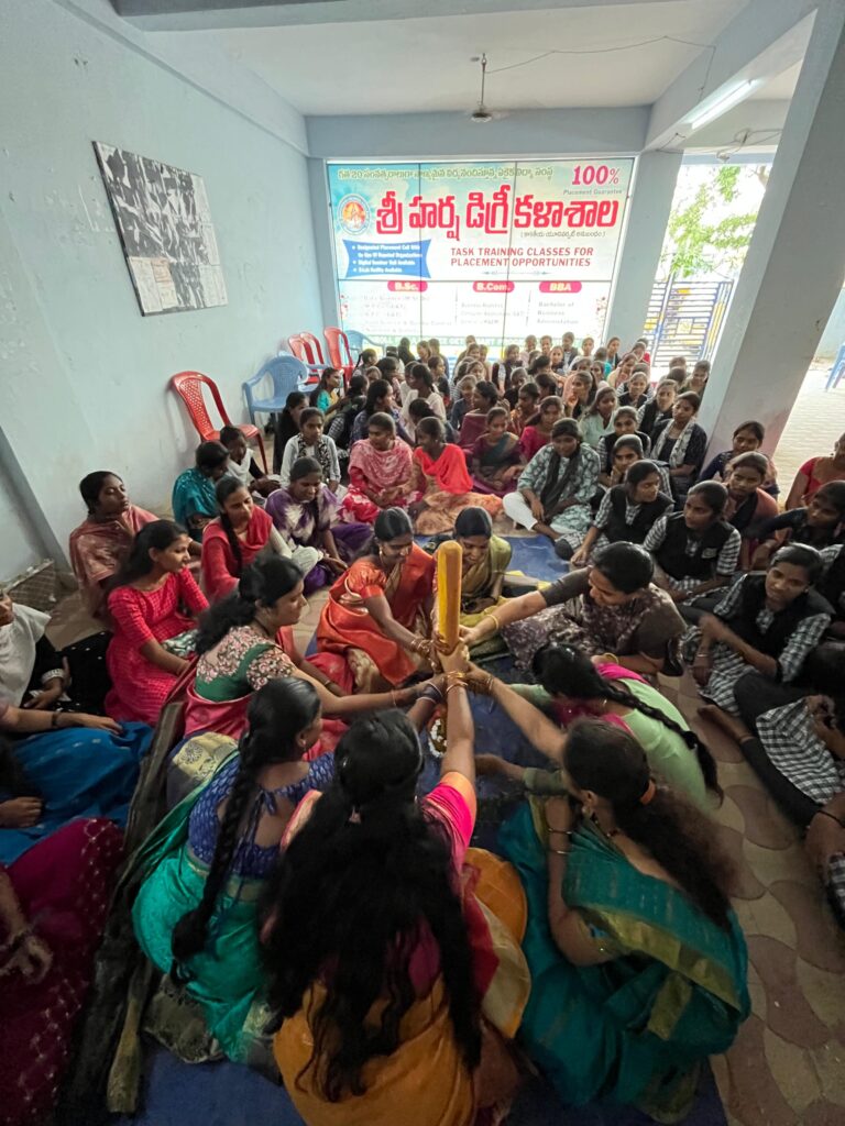 మంచిర్యాల ప్రత్యక్షత:- తెలంగాణ సంస్కృతి, సాంప్రదాయాలను నేటి తరానికి చాటి చెప్పారు శ్రీహర్ష డిగ్రీ కళాశాల విద్యార్థినులు, మహిళ అధ్యాపకులు, యాజమాన్యం శనివారం కళాశాల ఆధ్వర్యంలో బోనాల పండగను ఘనంగా నిర్వహించారు. మహిళా అధ్యాపకులు బోనమెత్తి సాంప్రదాయ పద్ధతిలో కళాశాల ఆవరణలో అమ్మవారికి బోనం సమర్పించారు. అనంతరం బోనాల పండుగ విశిష్టతను శ్రీహర్ష కళాశాలల చైర్మెన్ పల్లె భూమేష్ స్పష్టంగా వివరించారు. ఆషాఢం మాసంలో ప్రజలందరు సుఖ సంతోషాలతో జీవించాలని వివిధ రూపాలలో మహిమ గల అమ్మవార్లను కొలవడం తెలంగాణ ప్రజల సంస్కృతిని అని తెలిపారు. బోనాల జాతర సందర్భంగా గ్రామ దేవతలైన పోచమ్మ, ఎల్లమ్మ, మైసమ్మ, బాలమ్మ, ముత్యాలమ్మ, మహంకాళమ్మ, పెద్దలమ్మ, దేవతామూర్తులకు కుంకుమ, చీరసారే, బోనాలతో నైవేద్యం పెట్టి మొక్కలు చెల్లించడం ఇక్కడి ప్రజల అనవాయితీ అని పేర్కొన్నారు.